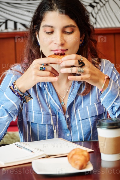 Молодая женщина наслаждается вкусной выпечкой