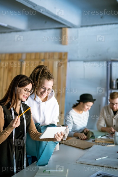 Две красивые молодые креативные женщины с планшетом обсуждают новые модели