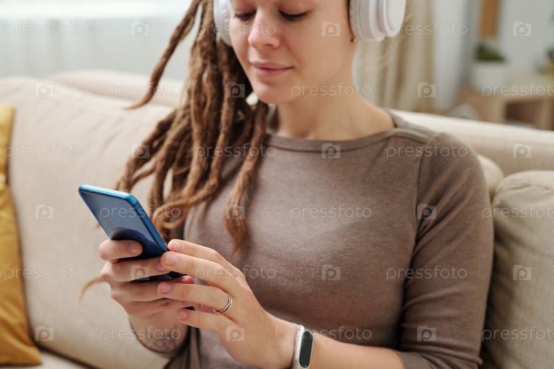 Руки молодой женщины с наушниками прокручивают в смартфоне музыку