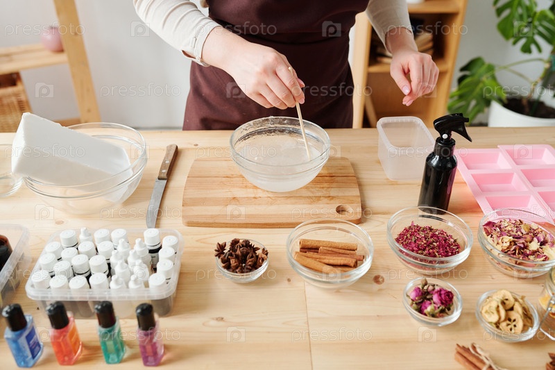 Молодая женщина в фартуке стоит за столом и смешивает жидкую массу мыла в стеклянной посуде