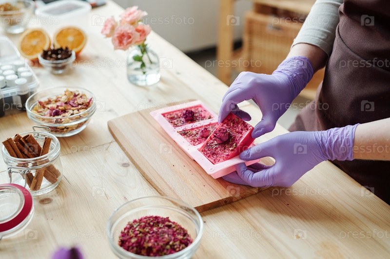 Руки молодой женщины, вынимающей свежее ручное розовое мыло из силиконовых форм