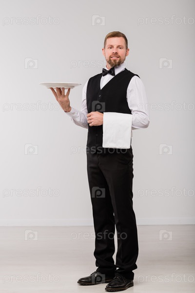 Счастливый молодой официант в элегантном костюме и галстуке, держащий белое полотенце и тарелку