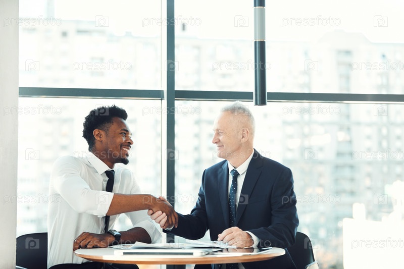 Удовлетворенные мультиэтнические бизнесмены в формальной одежде сидят за столом и обмениваются рукопожатиями после подписания важного контракта
