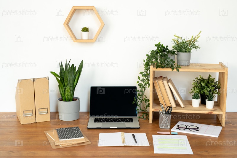 Композиция объектов для работы менеджера, дизайнера или студента на столе у стены