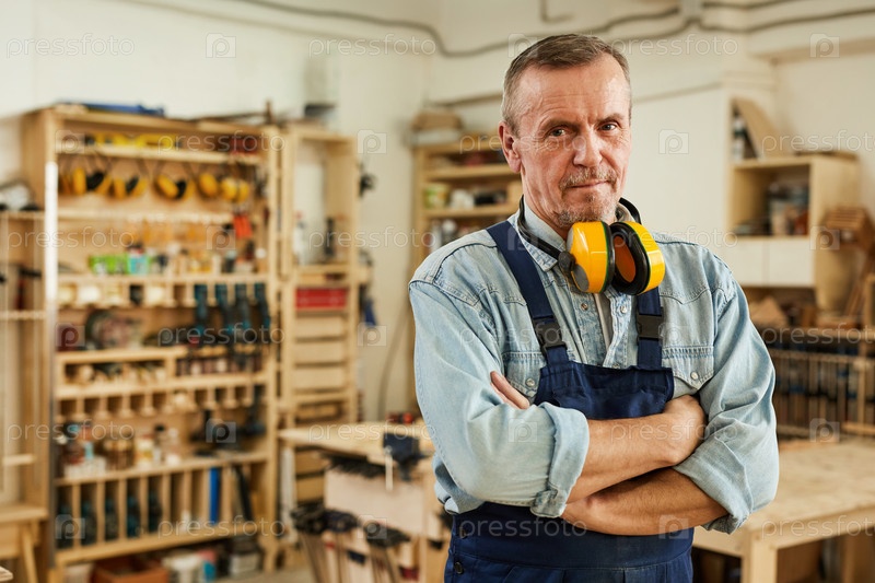 Старший плотник позирует в мастерской