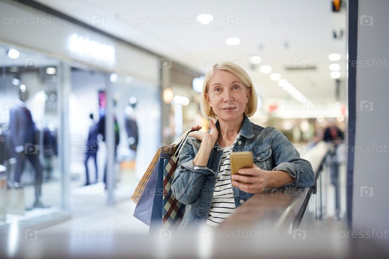 Привлекательная зрелая леди отправляет фотосообщение другу во время покупок