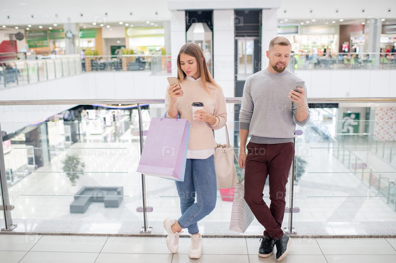 Миллениалы в повседневной одежде прокручивают смартфоны, стоя у перил
