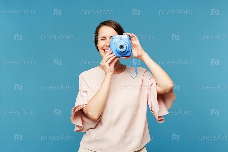 Молодая женщина-фотограф с синей камерой