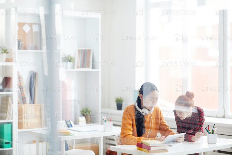 Серьезные многоэтнические студентки в непринужденной одежде сидят за столом и используют современный планшет, отдыхая во время перерыва