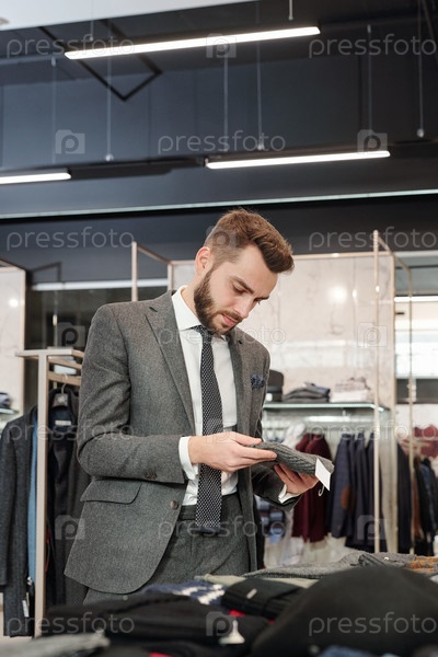 Молодой хорошо одетый мужчина смотрит на новую коллекцию в бутике