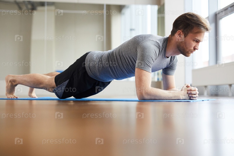 Концентрированный мужчина делает позу на доске