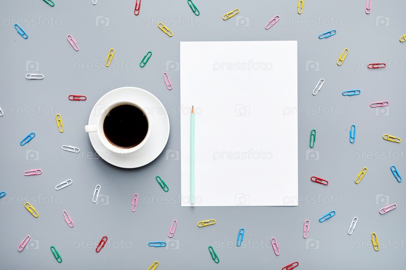 Высокоугольный вид кофейной чашки и бумажного листа на столе с беспорядочными цветными бумагами на сером фоне