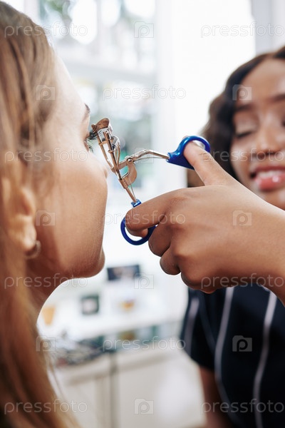 Макияж-художник закручивает ресницы клиента
