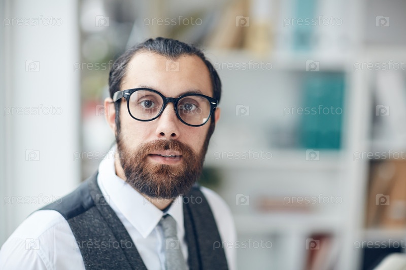 Портрет напуганного умного молодого бородатого предпринимателя в очках, работающего в офисе