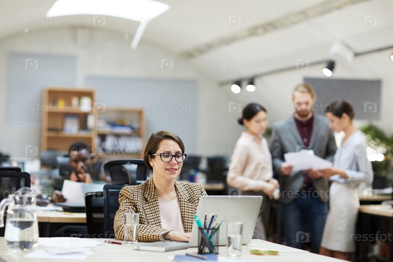 Улыбающаяся деловая женщина, работающая в офисе открытого пространства