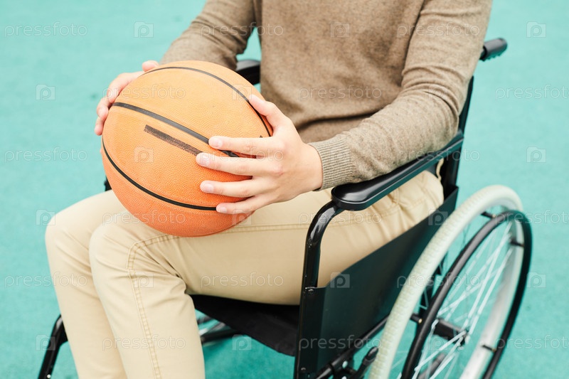 Близкий план неузнаваемого баскетболиста в свитере, сидящего на инвалидной коляске и держащего мяч на спортивном поле