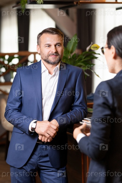Бизнесмен средних лет стоит у стойки бара во время общения с коллегой