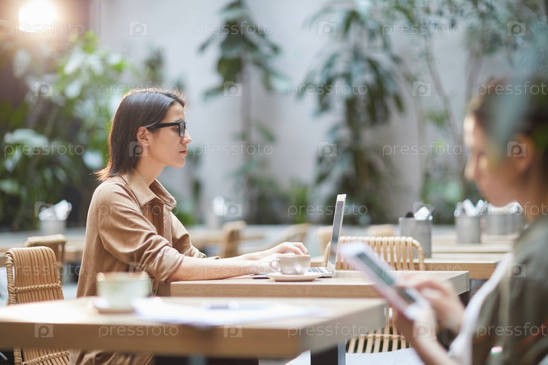 Элегантная деловая женщина, использующая ноутбук в кафе