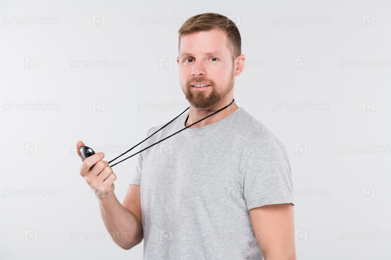 Молодой бородатый спортсмен со стоп-часом, проверяющий результаты бега во время тренировок