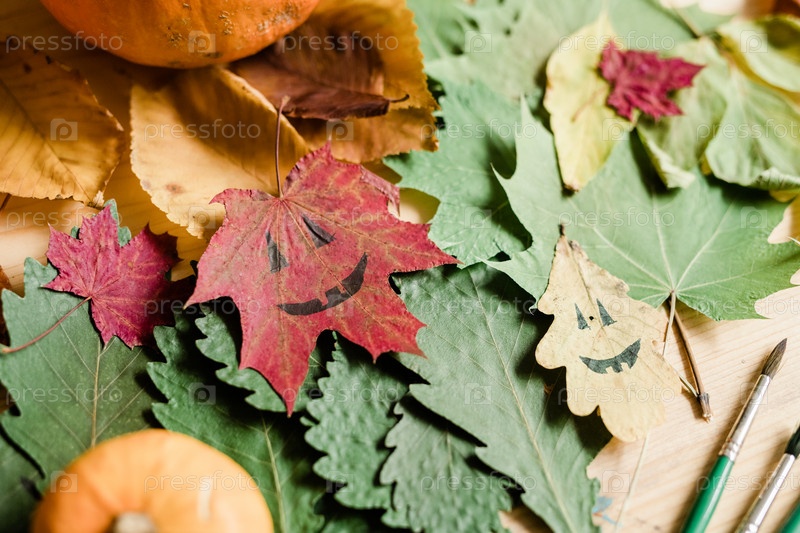 На фоне сухой осенней листья, лица Хэллоуина на листах и кистей