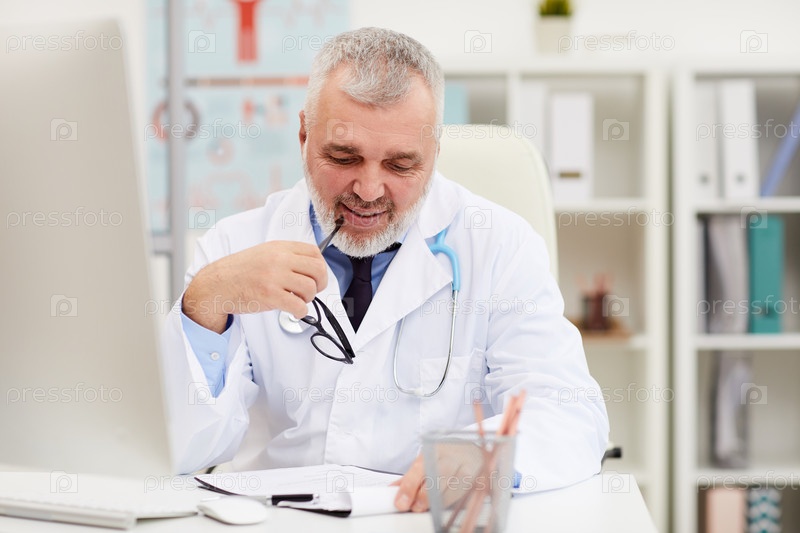 Зрелый врач читает медицинскую карточку