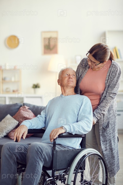 Серьезная пожилая женщина в очках толкает инвалидное кресло с мужем, заботясь о нем дома