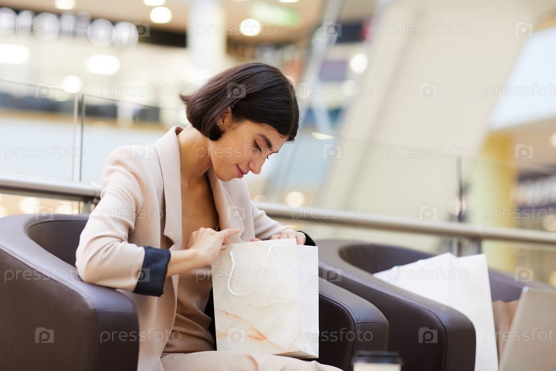 Улыбающаяся молодая женщина смотрит в сумку