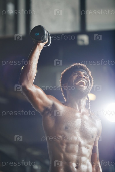 Мускульный Черный мужчина поднимает гантели