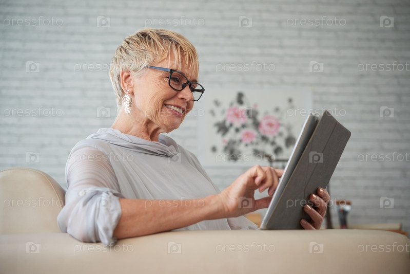 Пожилая женщина, использующая планшетный компьютер