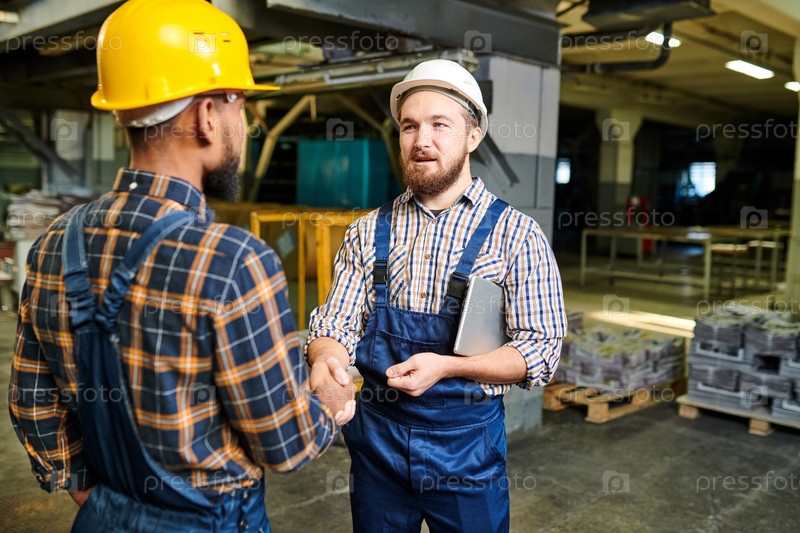 Сотрудничество инженеров: контент уверенный красивый молодой бородатый мужчина в хардхет держащий планшет и рукопожатие с арабским коллегой на складе типографического завода