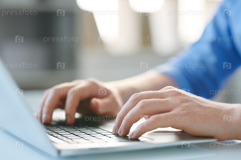 Руки молодого мобильного мужского сотрудника, нажимающего клавиши клавиатуры ноутбука