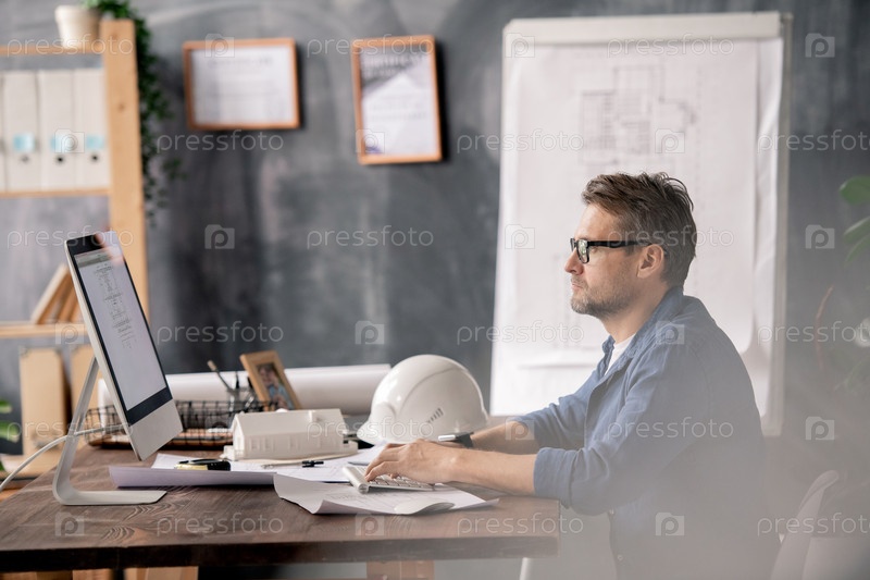 Зрелый компетентный инженер в повседневной одежде, смотрящий на компьютерный экран и печатающий