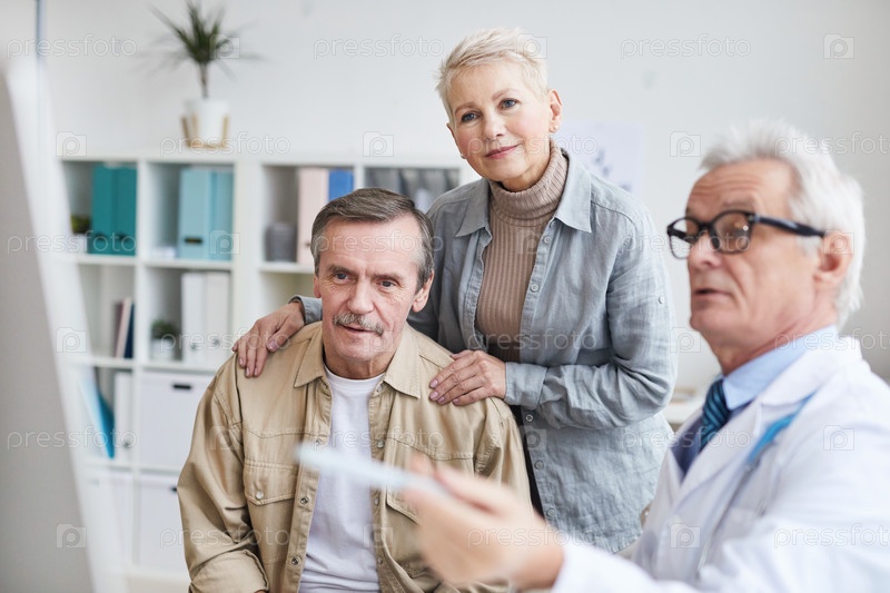 Зрелый мужчина, обнятый женой, сидит в кабинете врача и слушает объяснения врачей, получая хорошие результаты медицинских тестов на прием