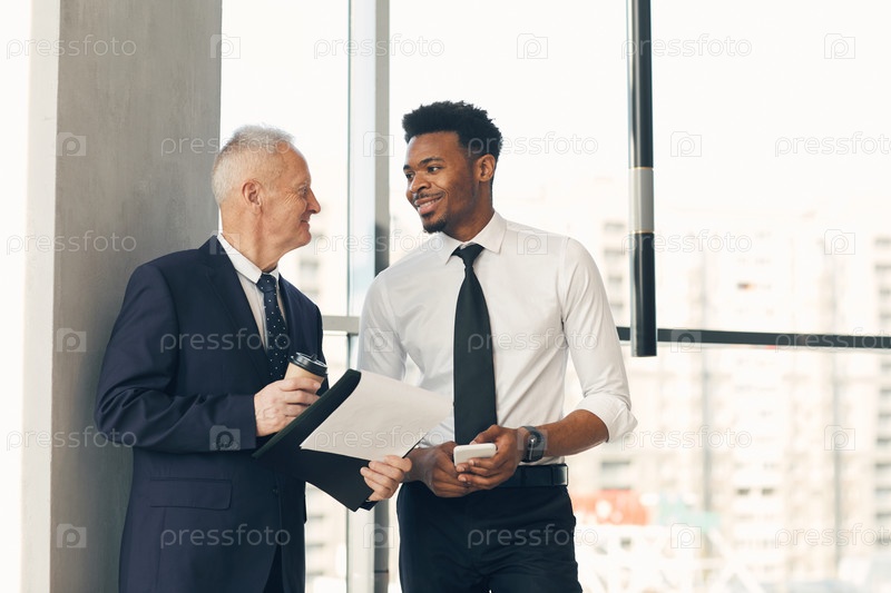 Позитивный уверенный старший бизнесмен с чашечкой кофе, держащий доску со своими документами и обсуждающий реализацию проекта с молодым черным менеджером по связям с общественностью