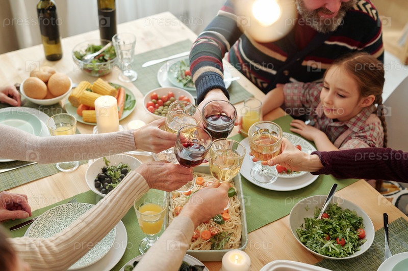 Руки семьи из шести человек, стучащих напитками за праздничным столом с домашней едой