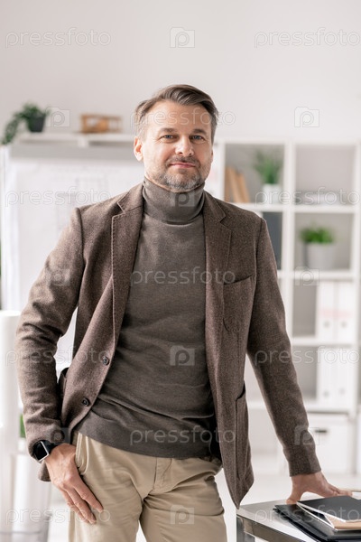 Современный зрелый инженер в формальной одежде, стоящий за столом в офисе