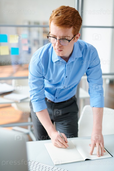 Молодой творческий студент или дизайнер делает заметки перед монитором компьютера