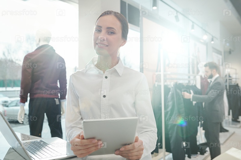 Довольно веселая продавщица в белой рубашке с помощью сенсорного панеля на рабочем месте