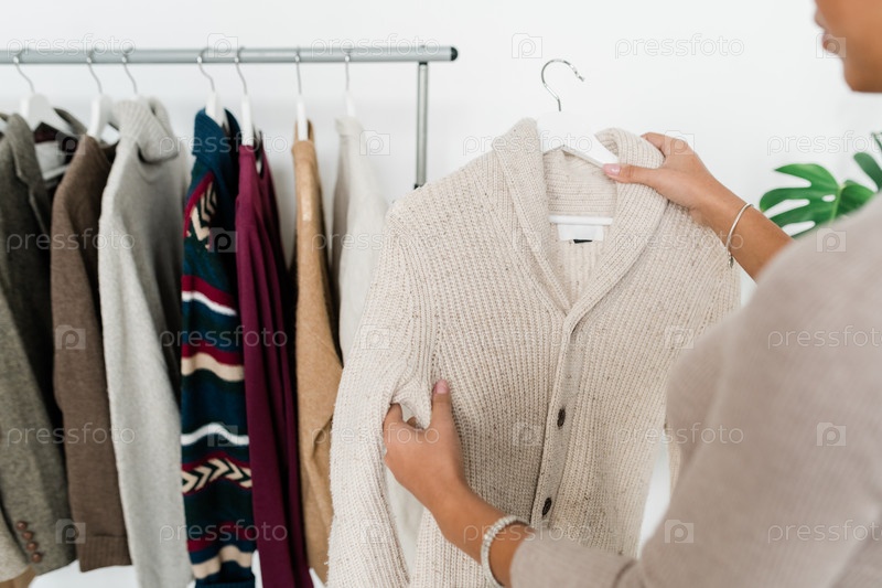 Casual white knitted cardigan on hanger held by young shopaholic Необычный белый вязаный кардиган на вешалке, который держит молодой шопохолик
