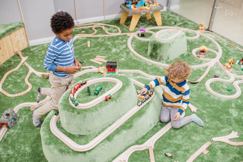 Два межкультурных мальчика проводят время на игровой площадке детского центра