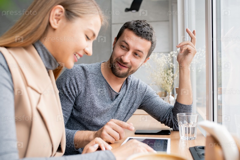 Счастливая молодая пара выбирает товары в интернет-магазине и обсуждает цены