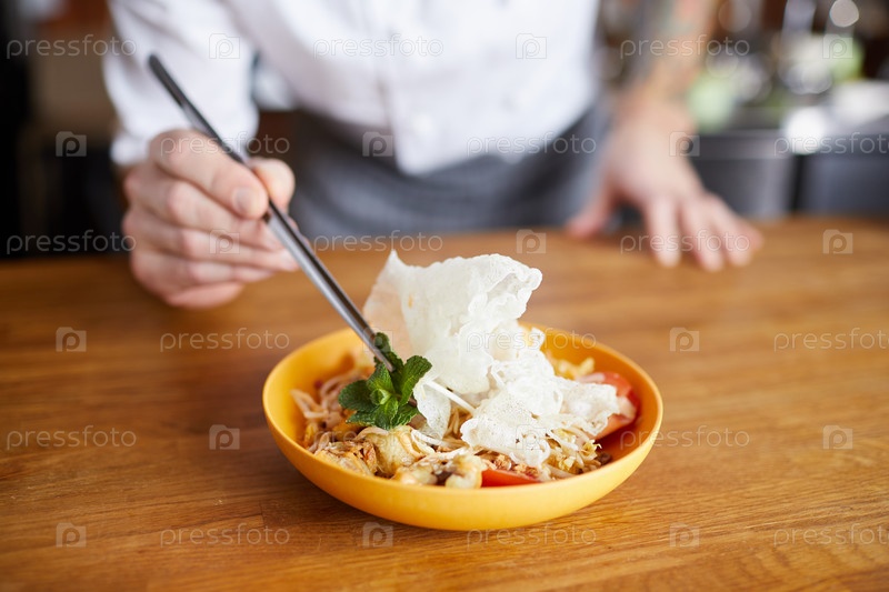 Добавление последнего штриха к азиатскому блюду шеф-поваром