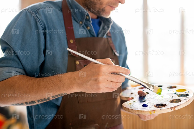 Современный художник в фартуке, держащий палитру со смешанными цветами и кистью