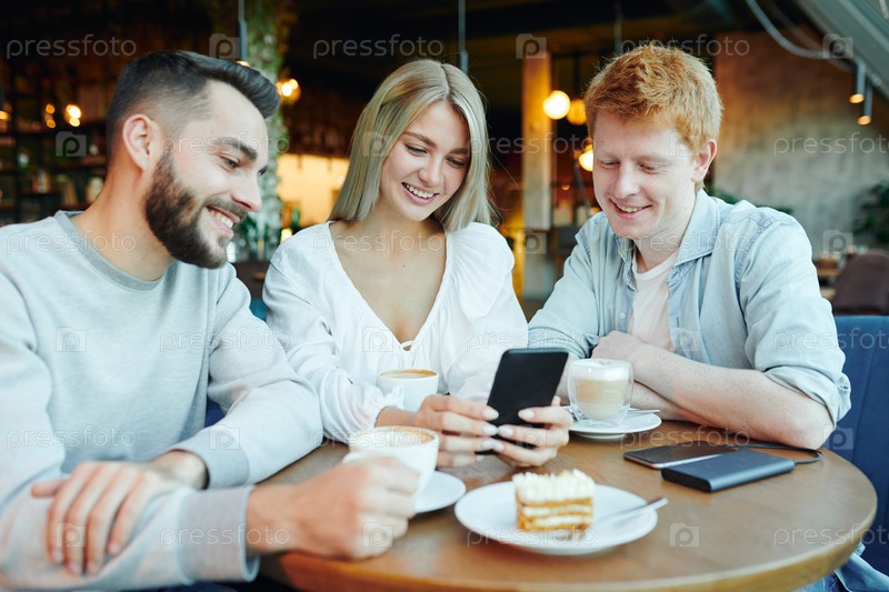 Красивая блондинка со смартфоном, показывающая двум счастливым парням свои новые фотографии в кафе