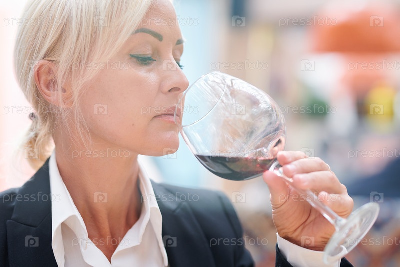 Профессиональная женщина-соммельер пахнет красным вином, проверяя его качество