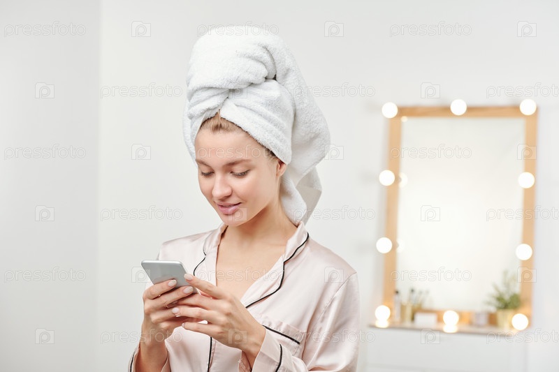 Молодая чистая женщина с мягким белым полотенцем на голове прокручивает смартфон