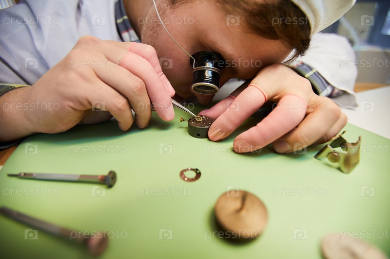 Близкий снимок концентрированного инженера фабрики наручных часов, носящего монокулярное увеличительное стекло с помощью пинцета во время сборки механизма часов