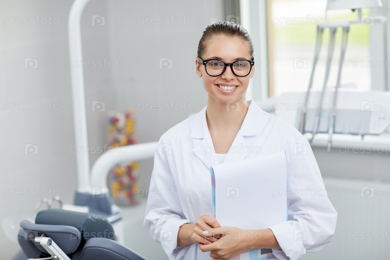 Дружелюбный женский стоматолог позирует в офисе
