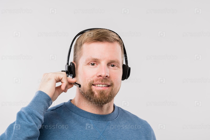 Счастливый молодой случайный оператор с гарнитурами консультирует клиентов онлайн в изоляции