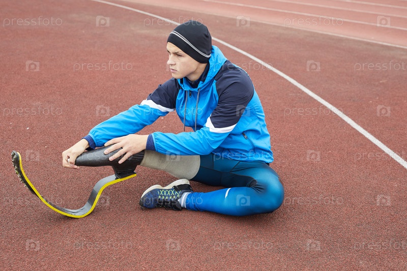 Серьезный решительный адаптивный бегун в осенней спортивной одежде сидит на трассе стадиона и делает разминку на свежем воздухе